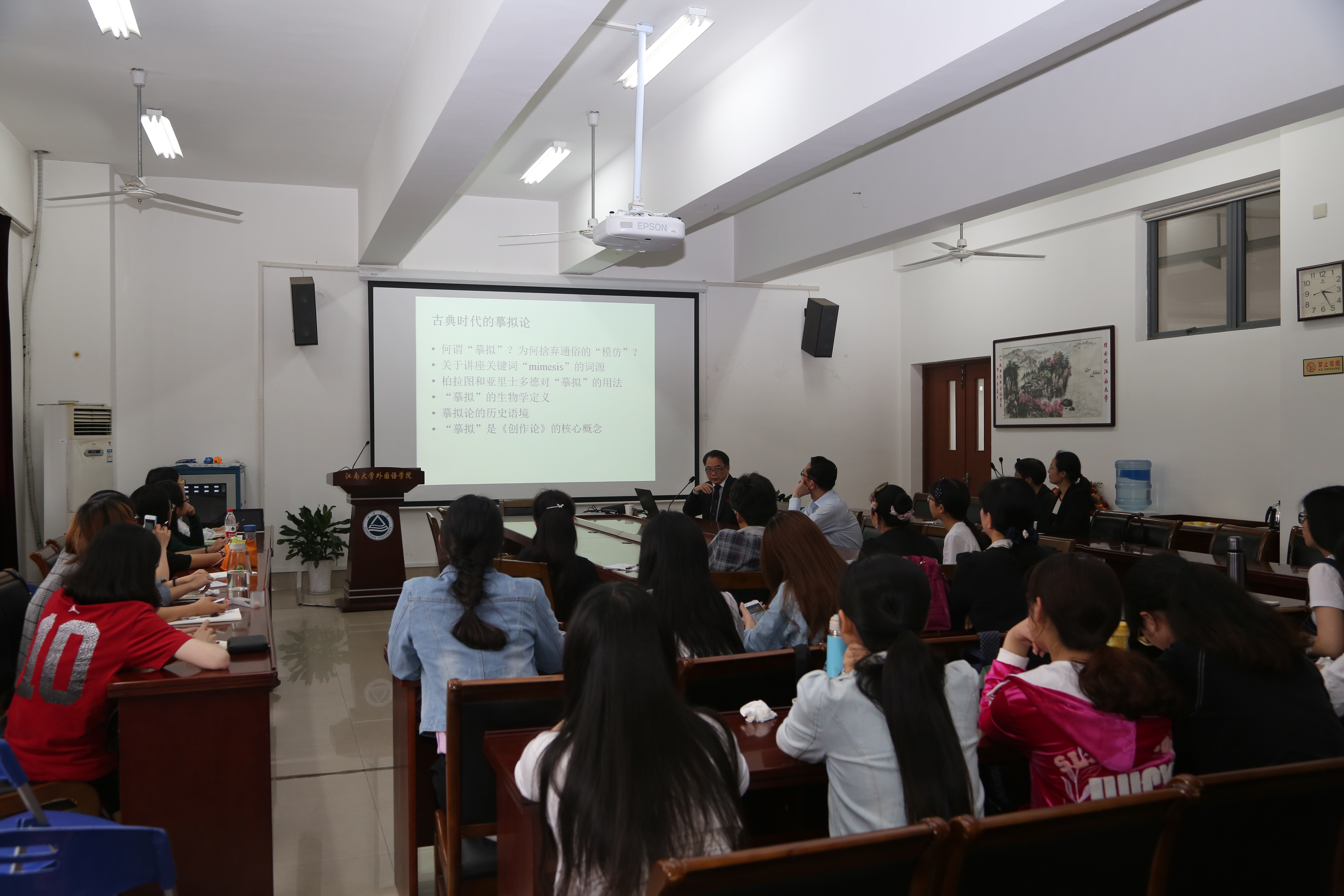 在领略了十六世纪英国文学经典的风采后,张汉良教授又带领师生们走进了符号学、哲学与美学相结合的殿堂。张教授以柏拉图的《诡辩家》、亚里士多德的《论记忆》和贺拉斯的《诗辩》为例,讲解了古典时代(公元前5-4世纪)的摹拟论,亚里士多德《创作论》的诗艺诗辩,以及艺术别类之间的摹拟与跨媒介符号学的兴起。张教授指出,摹拟区别于模仿,摹拟是创作的动机和鉴赏的条件,摹拟的本能正是艺术的起源。摹拟作为一个艺术总类,是亚里士多德《创作论》的核心概念。
