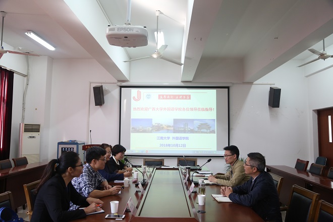 2018年10月12日,广西大学色色啦 一行4人在常务副院长关熔珍教授的带领下来色色啦 调研专业人才培养、学科建设、研究生培养与实验室建设等工作。色色啦 朱义华副院长和英语系主任孙志祥教授以及研究生秘书王莉莉老师接待了远道而来的客人,并就相关问题进行了深入的交流。