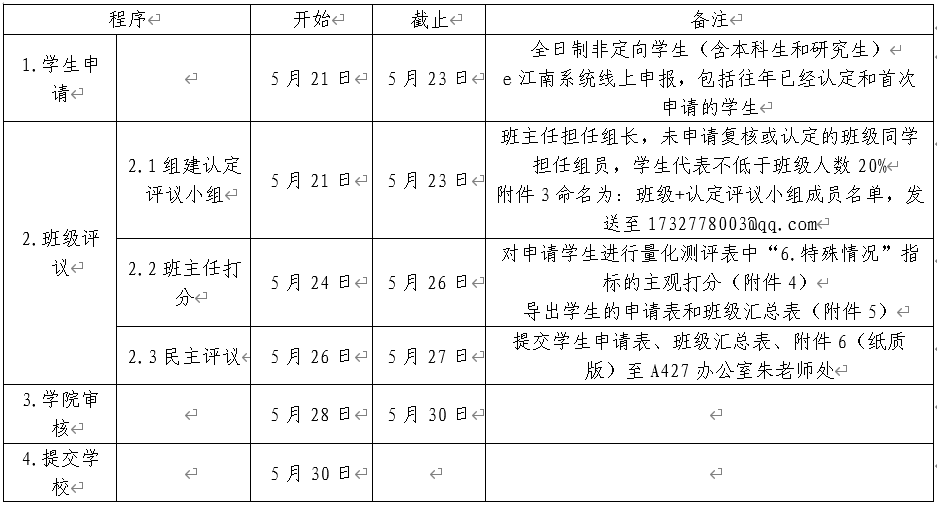 3. 班级评议小组结合学生在校期间生活表现及日常消费行为等,严肃认真地开展民主评议,做好《班级(专业)认定评议小组评议记录》(附件6),最后确定本班级家庭经济困难学生建议名单及等级,并以适当方式在班级(专业)范围内通报。将导出的学生申请表、班级汇总表、附件6(纸质版)于5月27日17:00前交至A427办公室朱家烨老师处。