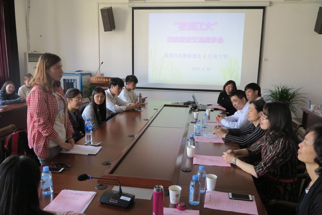 日语系主任崔明姬老师主持了会议。梁溪区民宗局邹鸣萍书记、袁翔副局长、民族促进会黄国斌会长及院党委副书记赵莹还有15名少数民族学生代表参加了本次座谈。