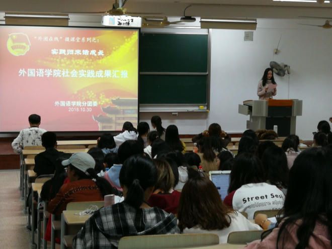 于2018年暑期组织了以“贯彻党的十九大精神·风正扬帆当有为”为主题的社会实践活动,为了使学生对活动有更深认识,10月30日晚上六点半,色色啦