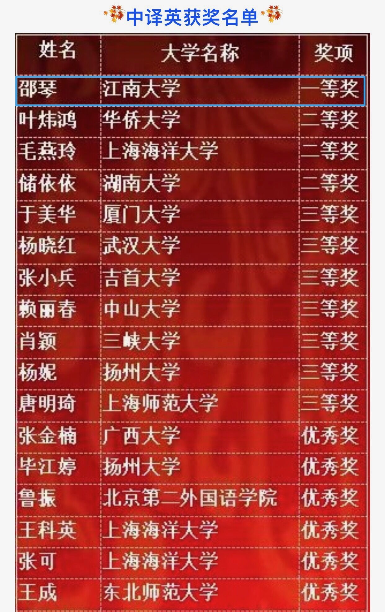 1010日到119日,为期一个月的比赛时间内,邵琴同学对汉语原文反复斟酌,找了大量海洋文学知,并通了数篇国有关海洋文学的秀作品,地道而专业的英及表达熟稔于心。阶段多困惑,教于学院郑赛芬博士和卞正副教授,探列姑射神人长臂捕鱼人文化负载词法。邵琴同学依靠异的中文理解能力,大的英表达能力以及耐心致的秀品,在完成初稿之后,又数易其稿,逐步改善文,最后从众多985学校(如:北京大学,武大学,中山大学,厦大学,湖南大学,重大学等等)的秀参赛选手中脱而出,独占鳌头