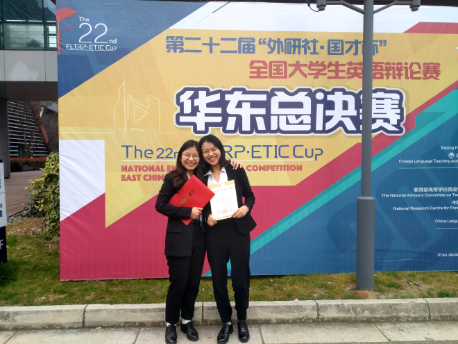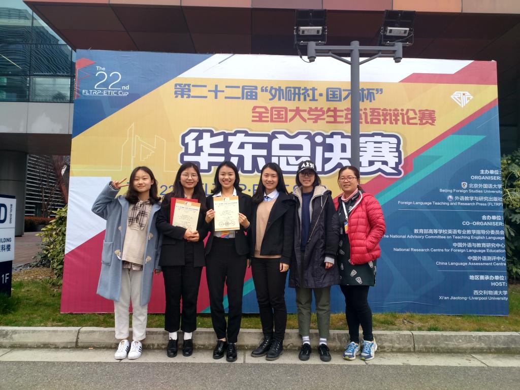2019322日至24日,第二十二届“外研社·国才杯”全国大学生英语辩论赛华东赛区总决赛在苏州西交利物浦大学举行。来自江苏、安徽、上海、浙江、山东5省市的110支高校代表团参加了本次比赛,争夺28个全国总决赛晋级名额。最终来自上海外国语大学、国防科技大学国际关系学院和复旦大学的队伍分别获得地区赛的冠军、亚军和季军。色色啦 英语专业1605班学生田怡凡和戚淼代表我校参加比赛,最终排名第16,成功晋级全国赛。