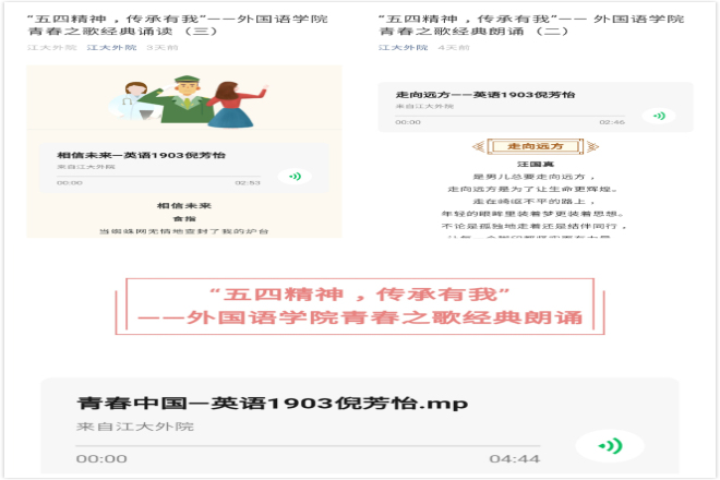 利用学院微信公众号推出三期青春之歌经典朗诵分享。第一期推出《青春中国》,第二期推出《走向远方》、《山高路远》,第三期推出《相信未来》、《热爱生命》。通过诵读经典,引导学生从经典中汲取精神力量,进一步加深对五四精神内涵的理解。