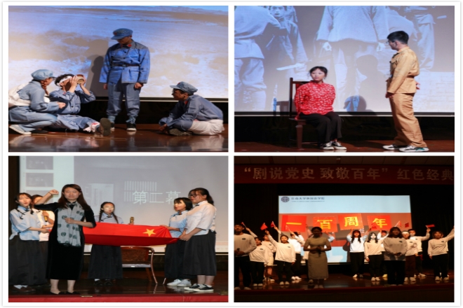 随后,红色经典剧目演出正式开始。在上半场的环节中,英语2004团支部带来的《风声》展现了共产党员为保护祖国付出的巨大牺牲;日语2001团支部演绎的《刘胡兰》歌颂了“生的伟大,死的光荣”的民族英雄;英语2003团支部表演的《金色的鱼钩》以英雄的事迹、动人的旁白吸引了在场观众,让那长满红锈的、闪烁着金色光芒的鱼钩,真切地展现在观众眼前;英语1903团支部带来的《无声红船漾波澜开天辟地换人间》演绎了中共一大这一伟大历史事件,伴随着热烈激昂的共产国际歌,共产党员代表们在浙江嘉兴的红船上,发出了自己内心最深沉的呐喊。