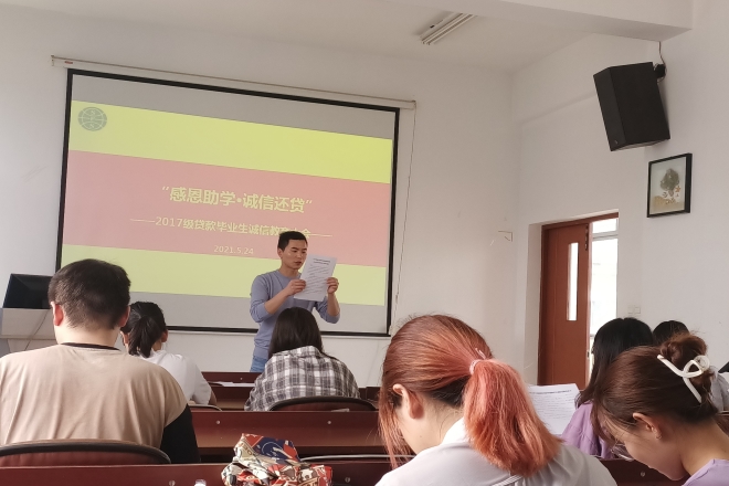 在A433召开贷款毕业生诚信教育大会。毕业年级全体贷款学生参与了此次大会,会议由辅导员苗文建主持。