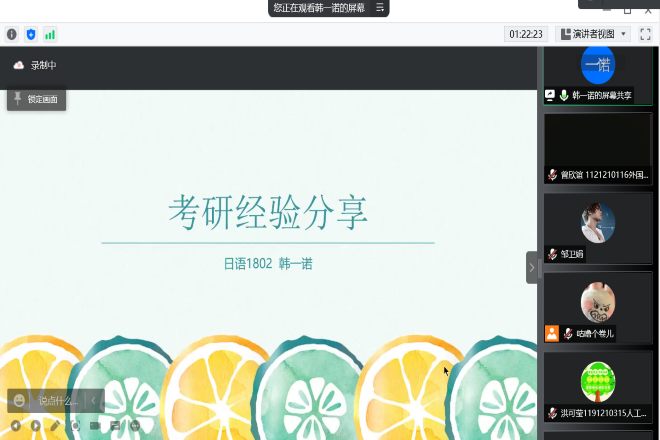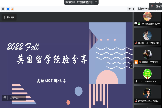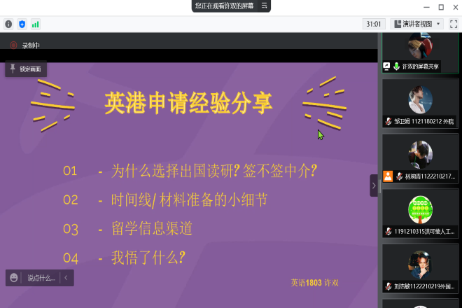 于5月5号、5月6号晚上,在腾讯会议室举行两场线上主题分享会,分享会邀请了18级国内、境外升学的7名优秀学生代表进行线上分享。