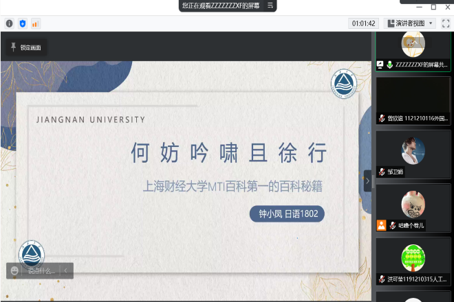 在5月6号进行的国内考研分享中,考研到外交学院的杨静怡同学主要针对MTI(翻译硕士),从时间分配和规划、专业课学习以及复试三个大方面,详细地介绍了自己的考研过程和感想;考研至中国海洋大学的谢淑敏先讲述了自己备考政治、日语、基础英语、综合英语四门考核课程的过程,建议专业课一定要尽早准备,打下基础;考研至上海财经大学日语MTI的钟小凤同学分别从日语MTI和百科知识与写作展开,分享了复习阶段的经验;韩一诺同学考研至北京外国语大学日语语言文学专业,她从选择、规划、心态三个方面入手,最后和同学们分享了调整心态的小建议,即如何输出坏情绪、保持好心情,有益地缓解同学们的考研焦虑问题。