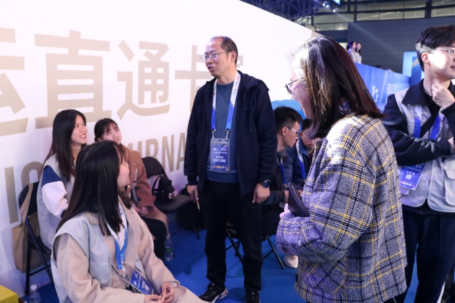 党委副书记刘伯贤、分团委书记陆芳到赛事场馆慰问志愿者,刘书记表示:志愿者们吃苦耐劳的工作精神、耐心且热心的服务态度展现了江南学子的良好风貌,希望大家在志愿服务的岗位上发光发热,在贡献青春力量的同时收获一份成长。