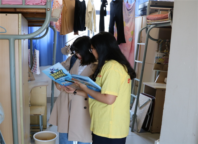 志愿者团员进宿舍发放并讲解“扫黑除恶”宣传单