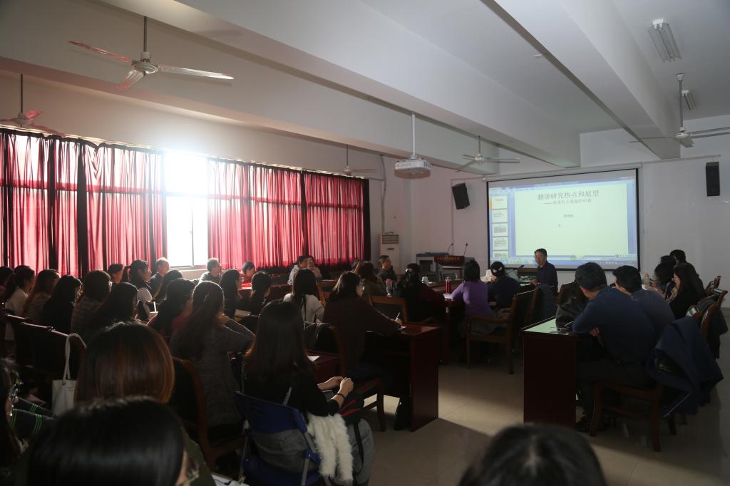 大会议室济济一堂,迎来扬州大学博士生导师周领顺教授题为“翻译研究热点和展望——兼谈有关课题的申报”的学术讲座。讲座由朱义华副院长主持。