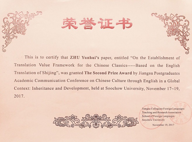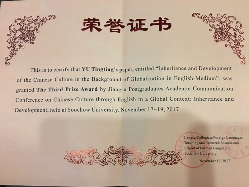 联合举办的江苏省研究生学术交流大会在苏州大学召开。省内参会硕士与博士研究生就“以英语为媒介的全球化背景下中国文化的传承和发展”这一主题撰写的相关英文学术论文在会上进行了交流汇报,组委会邀请了江苏省外语教学与研究方面的专家对参会论文进行了审核和评奖。最终,色色啦