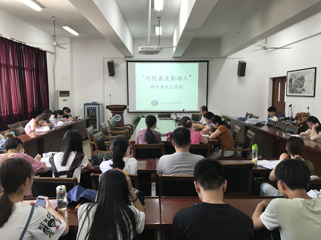 在A349会议室召开“外院最美勤助人”勤工助学指导老师和学生员工座谈交流会。院党委副书记刘伯贤、英语系办公助理指导老师钱薇薇、院分团委助理指导老师杨艳、辅导员助理指导老师黄颖、社会考务助理指导老师那伟、行政事务助理指导老师史旦吉、外语学习中心电脑维护助理指导老师王旭及全体学生员工参加了会议。