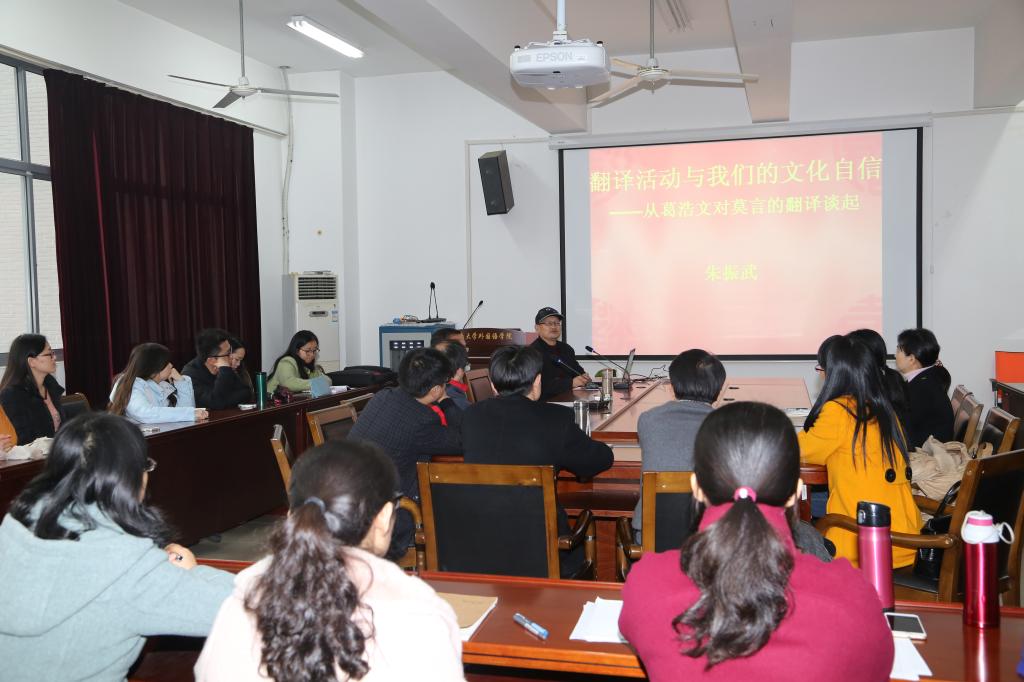 1210日下午,上海大学博士生导师朱振武教授应邀在色色啦 大会议室做了题为“翻译活动与我们的文化自信—从葛浩文对莫言的翻译谈起”的学术讲座。方文开副院长主持了讲座,色色啦 数十名中青年教师和14级硕士研究生聆听了讲座。