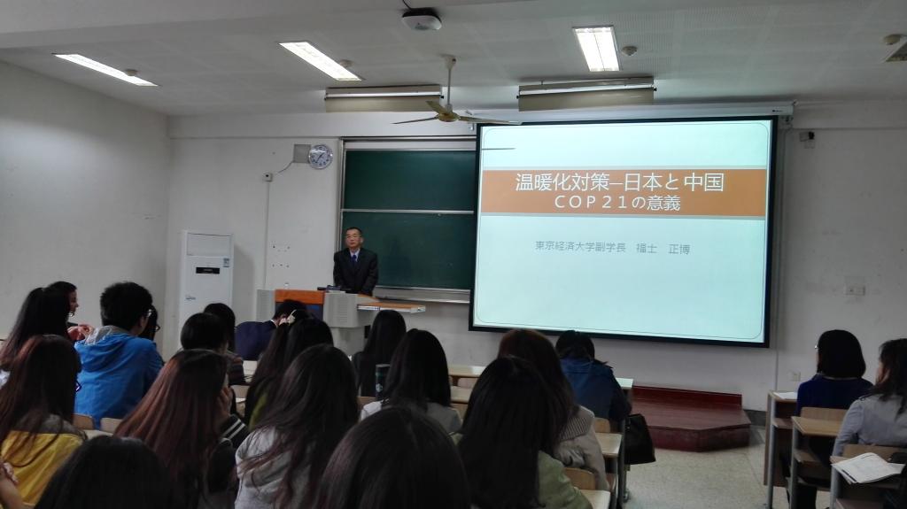 讲座中福士正博教授就全球气温变暖,为全体师生讲授自己的心得体会。教授在讲座中通过各种数据分析了当今全球气候变暖已经日益严峻的形势。指出由于化石燃料,煤炭和石油等大大量使用,以及无处理排放的废气等原因,使得全球气温持续不断升高。同时福士正博教授强调,这一问题的解决需要世界各国携手努力,精诚合作,坚持可持续发展的道路,共同开发新能源才等坚持不懈的努力,才能保护地球生态,为人类生存创造良好的环境。