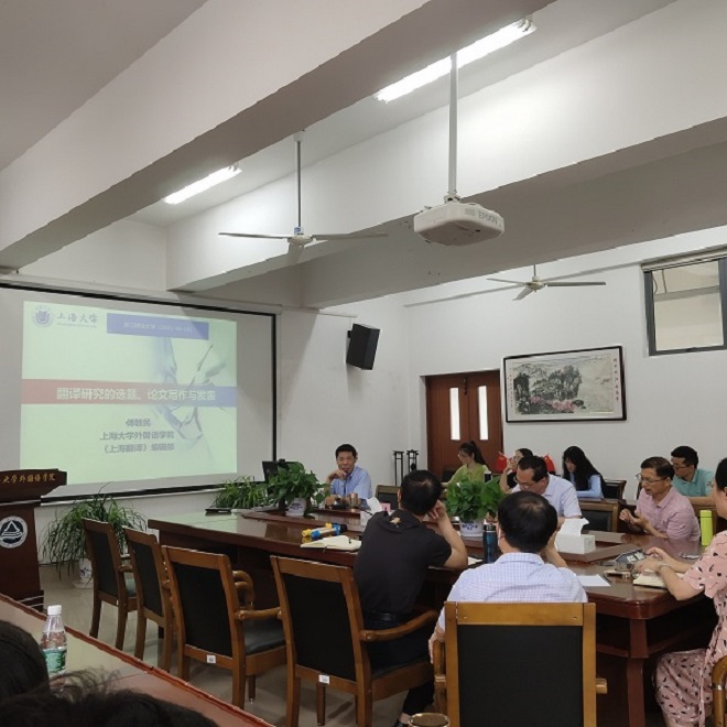 最后,傅教授围绕如何写出高质量论文,从题目、摘要、文献综述以及参考文献等各个环节详细阐述了翻译论文的写作规范和要求,结合自己作为学者和杂志主编的心得,强调论文投稿要清楚投稿杂志的学科定位,减少投稿的盲目性,并向在场师生分享自己的学术研究体会。