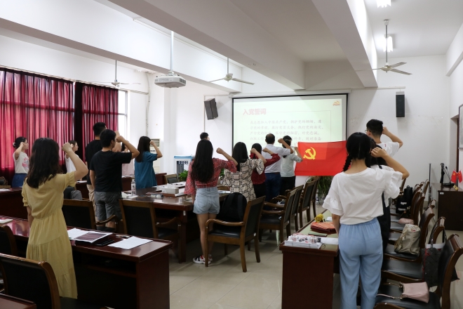 在A349会议室举行毕业生党员教育大会暨新党员入党宣誓仪式。学院党委副书记刘伯贤、分团委书记陆芳、毕业年级全体党员、今年新发展的党员都参加了本次会议,会议由分团委书记陆芳主持。