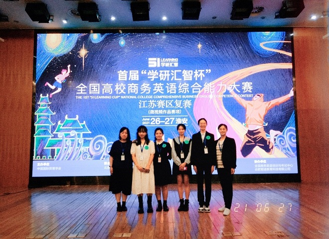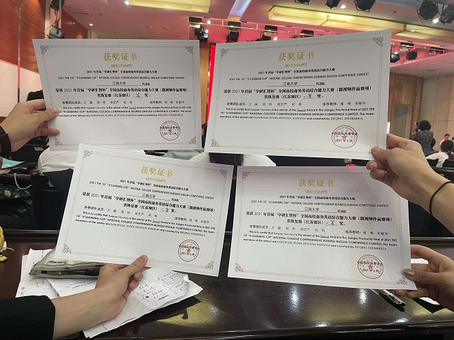 初赛中脱颖而出,代表学校参加复赛。在谢晴和朱敏华老师的精心指导下,参赛选手赛前进行了充分的准备和演练,包括前期的微视频制作、赛前的PPT设计以及打磨熟记演讲稿,最终选手们在视频制作、知识竞赛以及现场赛中表现优异,获得省级复赛(江苏赛区)二等奖。此次比赛锻炼了参赛学生的英语应用能力、跨文化交际能力和“商务+英语”的复合型能力,同时也为培养学生提高商务英语综合素质、以赛育人、思政育人以及商务英语课程教学留下宝贵经验。