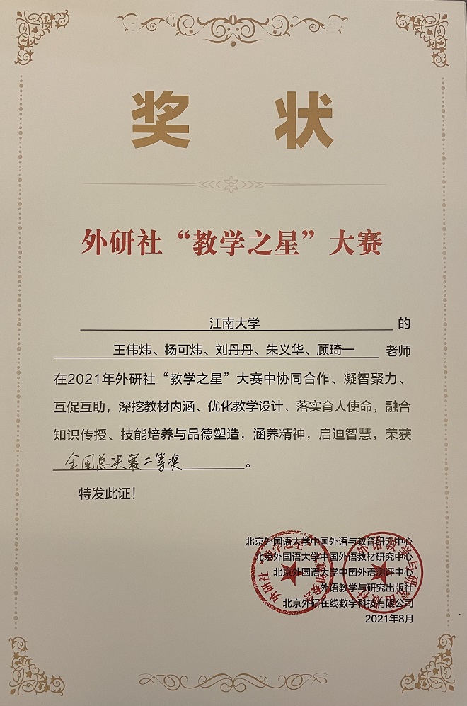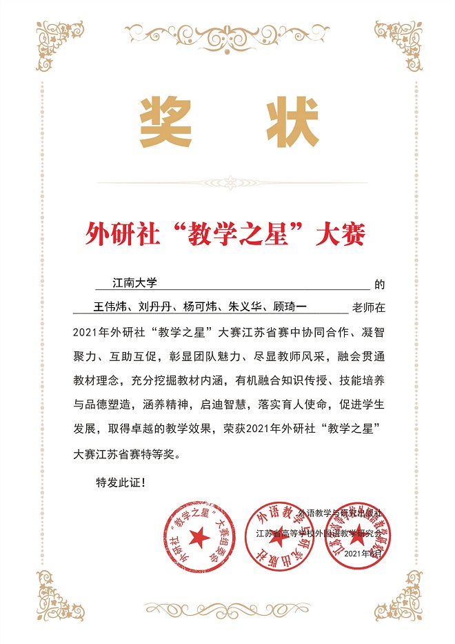 王伟炜、杨可炜两位教师代表“大学英语”课程教学团队(王伟炜、杨可炜、刘丹丹、朱义华、顾琦一),经过层层选拔,在获得江苏省特等奖后从全国395个大学英语团队中脱颖而出,取得了全国总决赛二等奖的好成绩,继2019年获“外教社杯”全国高校外语教学大赛三等奖后实现了我校在国家级外语教学大赛中新突破。