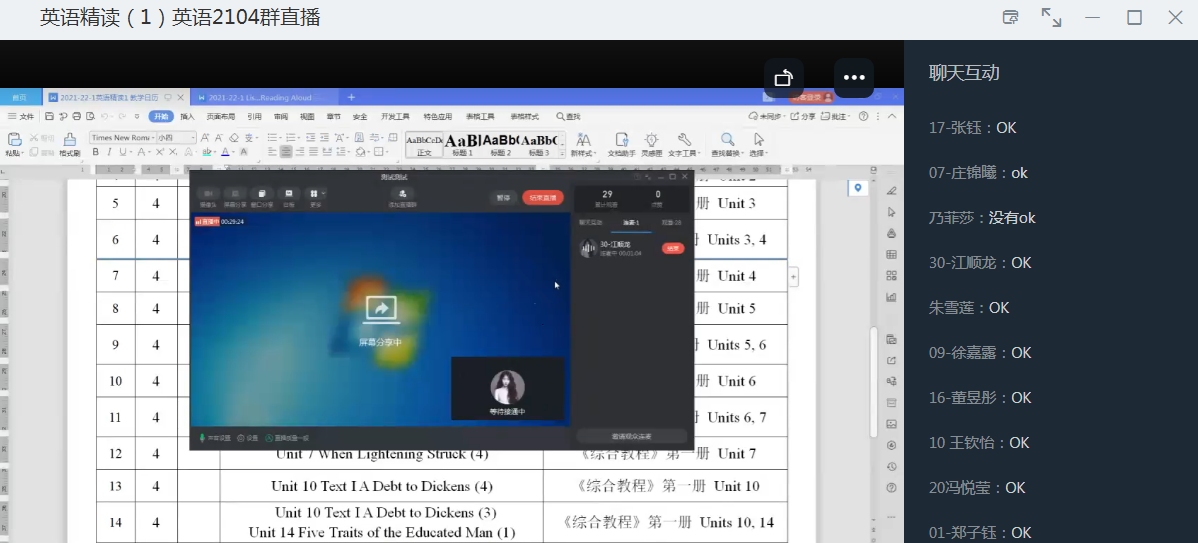 英语系积极响应,提前谋划,在总结以往在线教学经验的基础上,各课程组根据课程特点和学习方式的不同,大胆探索,勇于尝试,寻求最适合的线上教学方式。8月26日,学院对所有教师进行钉钉平台的在线教学培训。通过金波和姜辰娟两位老师的培训,大家全面“复习”了钉钉平台的直播基本操作,并了解了钉钉平台新开发的视频会议“课堂直播”功能。培训完成后,系部立即展开了线上教学群体的组建。在两天内,老师们共搭建了109个线上教学主要群体,每个教学班还配备了备用教学平台,以应对可能出现的意外情况。