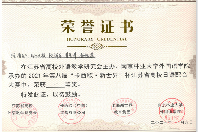 19级学生杨清妍、赵秋棋、段祥乐、翟晋津、杨钰滢等五位同学在日语系中西由美子和田村恭平等老师的悉心指导下,努力拼搏,最终斩获该项赛事的一等奖。