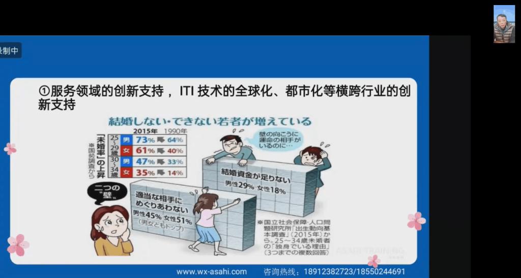 日语系师生以线上会议的形式参与了“少子老龄化日本社会的机遇和挑战”学术讲座。本次讲座由日语系主任崔明姬主持,主讲人上海交通大学日本研究中心兼职教授魏海波老师结合自身经历从严峻的后疫情时代现状,日语专业学生迎接挑战的对策,日本一流大学大学院选择原则以及后疫情时代的学习方式变化四个方面进行了生动详细的阐述。魏海波教授曾任上海政治学会理事,上海法学会理事,上海市委宣传部特约研究员,上海市委组织部特约研究员,上海侨商会理事,浦东新区留学生联谊会常务理事。日本三菱综合研究所研究员研究亚洲经济和中国经济,在国内外学术杂志主要专业论著论文50篇。