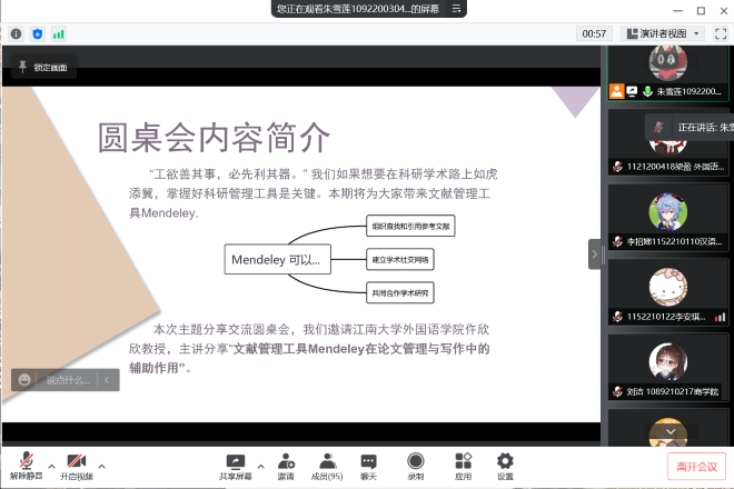 仵欣欣教授线上主讲“文献管理工具Mendeley在论文管理与写作中的辅助作用”,会议持续近一小时,来自各个学院的120余名同学线上参与,共同了解学习Mendeley。