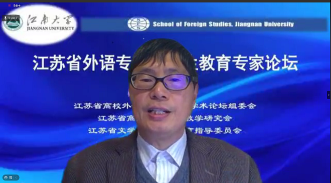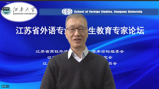 师资队伍、科研团队、科研成果等基本情况,并向各位专家及嘉宾的到来致以热烈的欢迎;随后,教育部高等学校大学外语教学指导委员会委员,全国大学英语四、六级考试委员会委员,江苏省高等学校外国语教学研究会会长,江苏省外国语言学会副会长,中国英语教学研究会计算机辅助外语教学专业委员会副主任委员,南京大学王海啸教授致辞,王教授从新文科建设和“双一流”建设等两大背景出发,高屋建瓴地剖析了学科建设的重要性以及未来学科发展的方向,同时指出立德树人在人才培养中的重要意义。