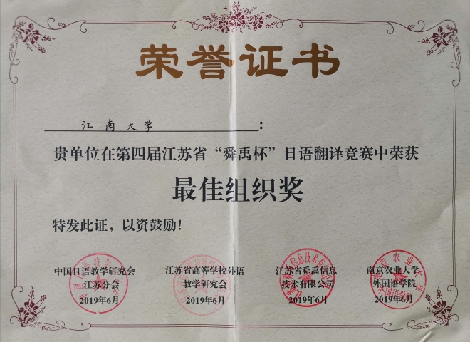 据悉,第四届江苏省“舜禹杯”日语翻译竞赛于2019年1月启动,在控制稿件数量的前提下,3月底截稿时共收到江苏省内26所高校和省外19所高校寄来参赛译文共计409篇,其中日译汉303篇,汉译日106篇,参赛者均是中文为母语的日语专业在校大学生或研究生。4月份经过翻译界专家及评委的匿名评审,共评选出入围稿件日译汉30篇、汉译日10篇。6月1日对入围同学进行现场加试,在紧张的专家现场评审之后,综合初赛成绩,评选出汉译日、日译汉的各级奖项及优秀组织奖。由崔明姬老师带队,色色啦