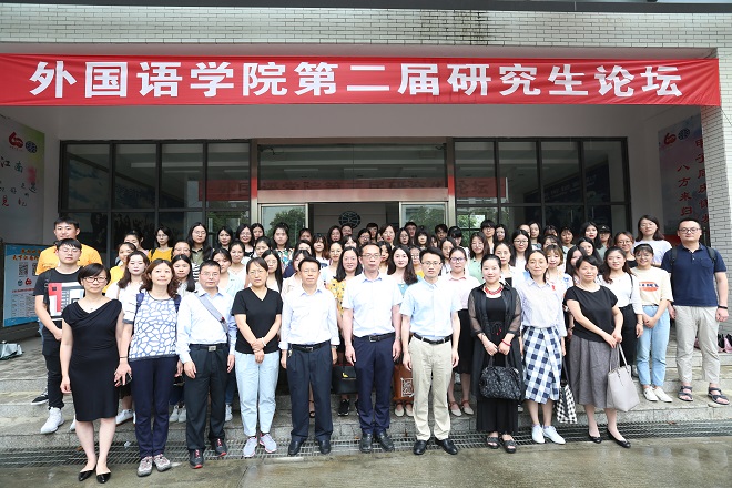 楼前合影留念。随后,文学组、语言学组、翻译组三个分论坛的发言分别在学院楼A349、A433、A529进行。出席分论坛的点评教师有张俊萍副教授、蒋怡博士、魏文博士,严敏芬教授、顾琦一教授、刘丹丹副教授,王金安教授、彭方针副教授和郑赛芬博士。分论坛共有24位同学进行了交流发言,在同学们发言之后,老师们针对发言进行点评与互动,从话题、视角、方法等方面反馈论文的优点和不足,并提出质疑与建议。此外,部分同学也与发言人就论文进行了互动与探讨。