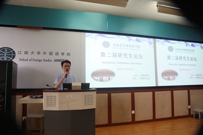 论坛包括五个环节:开幕式、主旨发言、合影留念、分论坛发言以及闭幕式。上午8时20分本届论坛在2C618拉开了序幕,出席开幕式的有外院全体研究生、导师与点评教师等。开幕式由朱义华副院长主持,朱院长诙谐幽默的话语活跃了开幕式的氛围,同时也提醒同学们要珍惜芳华,刻苦钻研,积极参与学术研讨,不让自己的青春留有遗憾。