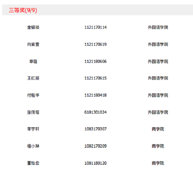 以英语为母语的外籍教师、具有丰富授课经验的写作教师刘梅副教授及资深文学方向教师蒋怡博士,评委们严格按照评分标准对参赛作文进行批阅。根据本次大赛的章程及组委会要求,经过线上评阅及线下评阅,本次校选赛共19位参赛者获奖(获奖名单中同一奖项获奖学生名字非按成绩排序,为Uchallenge系统自动排序)。