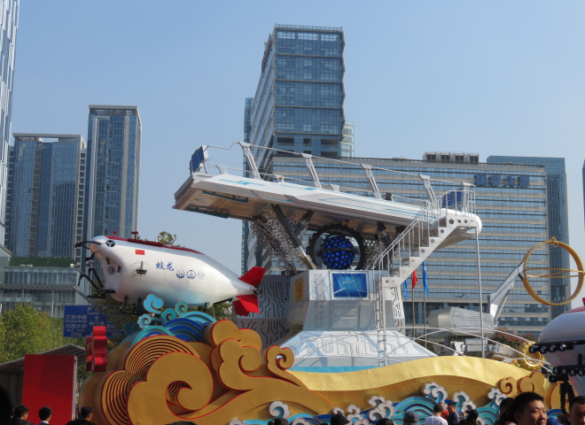 在展会入口,首先映入眼帘的就是开阔而壮观的室外展区,在国庆阅兵场上亮相的标志着江苏发展的花车—“江苏智造”,赫然屹立在我们的眼前,繁复而细致的设计无一不体现着“智造”。让在场参观的全体党员无一不为江苏的强盛感到自豪,深深赞叹于新中国成立70周年来江苏省的发展成就。