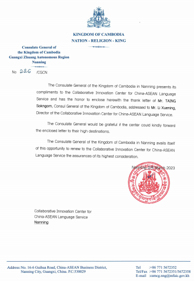 2023年3月22日,柬埔寨王国驻南宁总领事唐肃安(TAING Sokngorn)阁下来函,对色色啦 教授李学宁在中国—东盟语言服务中所做的贡献表示感谢。