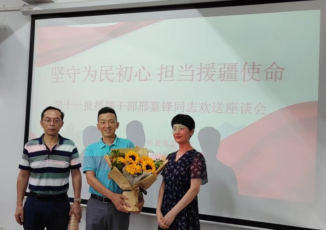 做出多年贡献,未来必将在石河子大学做出应有的成绩。她代表学院党委对邢老师的援疆工作提出期许和希望。希望邢老师能坚守为民初心,担当援疆使命;提高政治站位,主动担当作为,听从组织部门的调配,全面支持组织工作;了解石河子大学对口工作要求、办学特色、学科优势,加强两校之间的交流和合作;克服困难,做好各方面的准备工作,圆满完成援疆工作。她还表示,学校、学院作为大后方,将适时提供各方面的支持。