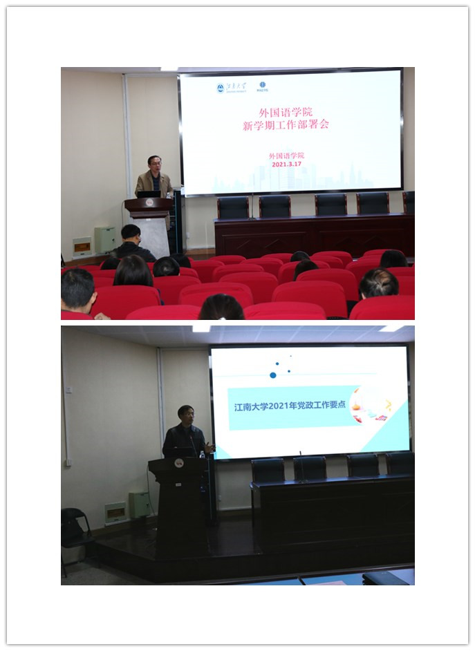 在文科楼B103召开新学期工作部署会,学院党委书记史志洪解读了学校2021年度党政工作要点,并就加强学院党建工作、全面从严治党和意识形态工作等做了重点介绍;院长方文开主要围绕校、院“十四五”规划阐述了学院当前面临的机遇与挑战以及学院今年和未来几年的工作目标和要求。