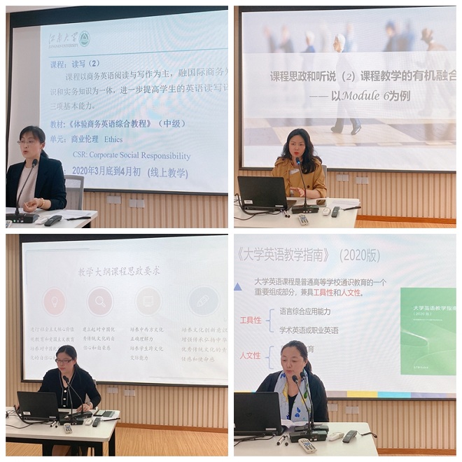 接着,拓展部四位老师结合《读写2》、《听说2》、《翻译1》、《翻译2》等具体课程分享了如何发掘大学英语课程的思政元素,并将课程思政的理念具体融入到大学英语教学实践和教学设计全过程,老师们的精心准备与热情分享了赢得了在场教师的热烈掌声。分享结束后,老师们结合分享的优秀举措,以课程组的形式就各自课程教学中的思政教育进行了深入交流。