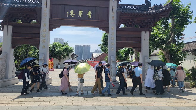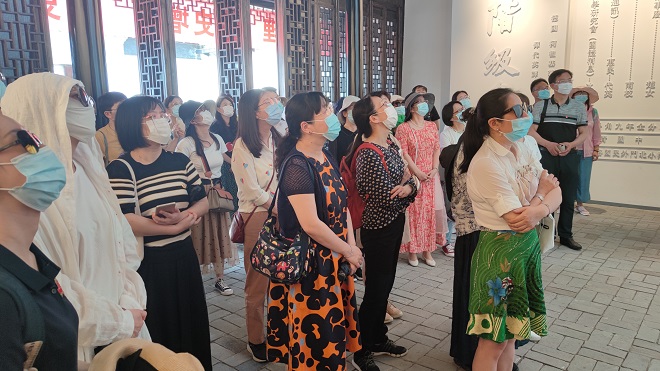 午餐后,老师们顶着烈日,徒步来到青果巷历史文化街区。青果巷是常州文脉之地,文风兴起唐代,簪缨世家聚居,书香盈巷,墨迹飘河,先后走出了近百名科举才俊和一大批近现代名人,也是瞿秋白和周有光的出生地,被誉为“江南名士第一巷”。老师们信步其中,感受着浓郁的历史文化气息,并深入史良故居、周有光图书馆、唐荆川纪念馆、赵元任艺术中心学习参观。