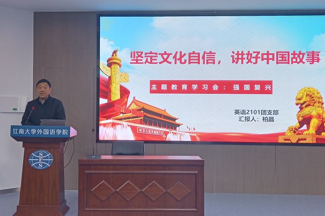 篇章一: 扬帆·强国复兴,明理增信。英语2101团支书柏晶带领大家深入学习领会习近平总书记在文化传承发展座谈会上发表的重要讲话精神,明晰了文化自信的重要性。随后,同学们就外语学子该如何坚定文化自信、传播中国声音、担负文化使命展开交流。