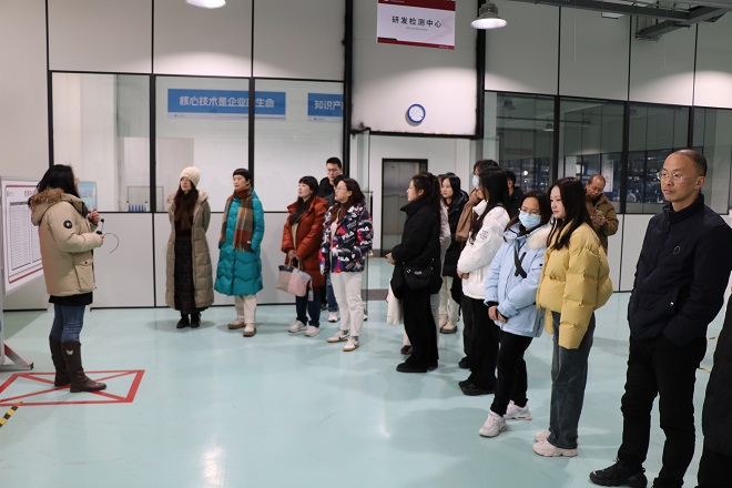 第二站,学院师生来到了江苏赛迪乐科技集团。该企业是一家专注于手动、电动、光伏电控内置遮阳百叶中空玻璃研发与制造的国家高新技术企业、“专精特新”小巨人企业,在海外建材市场占有可观的市场份额。李荣华充分肯定了赛迪乐先进的设计研发、生产制造和检验检测,详细了解公司的人才需求及招聘计划。赛迪乐方也表示,希望未来可以与色色啦