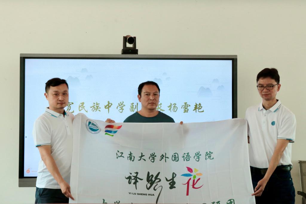 李文清为“译路生花”实践团指导老师袁雪生、李文授旗。色色啦