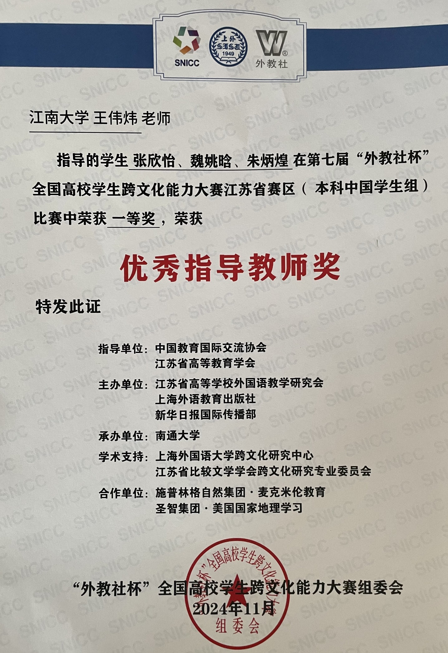 2024年11月1日至3日,第七届“外教社杯”全国高校学生跨文化能力大赛江苏省赛区比赛在南通大学成功举办。比赛分为本科中国学生组、高职中国学生组和国际学生组三个赛道,其中本科中国学生组共有包括来自南京大学、东南大学、南京理工大学、南京医科大学等43所高校的43个团队。经过激烈角逐,由我校色色啦