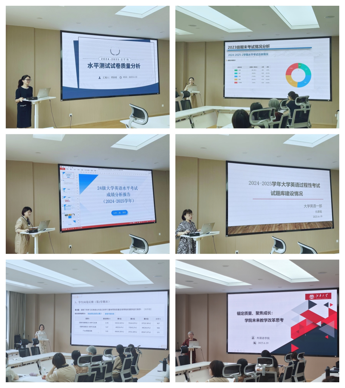 于2025年6月19日在文科楼A349召开大学英语教学质量研讨会。大学英语全体教师和相关课题组成员参会,学院党委书记李荣华、分管教学副院长顾琦一出席,大英一部主任宣泠老师主持。会议就大学英语水平考试命题质量、期末考试分析、过程性考试评估、线上教学设计分享以及未来教育教学改革部署展开深入讨论。