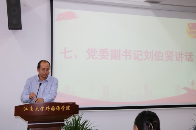 会议最后,学院党委副书记、副院长刘伯贤老师讲话。他首先回顾了特称团支部的发展历程,对英语1904团支部的优秀表现给予了肯定,对新一届特称团支部寄予希望。同时,他对在场的各位团干部提出三点建议:一要学习先辈精神,感悟爱国情怀;二要加强修身历练,保持活动热情;三要传承特称精神,加强典型示范。